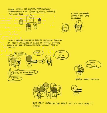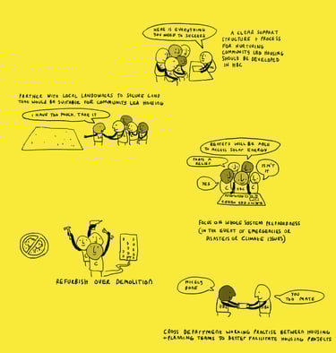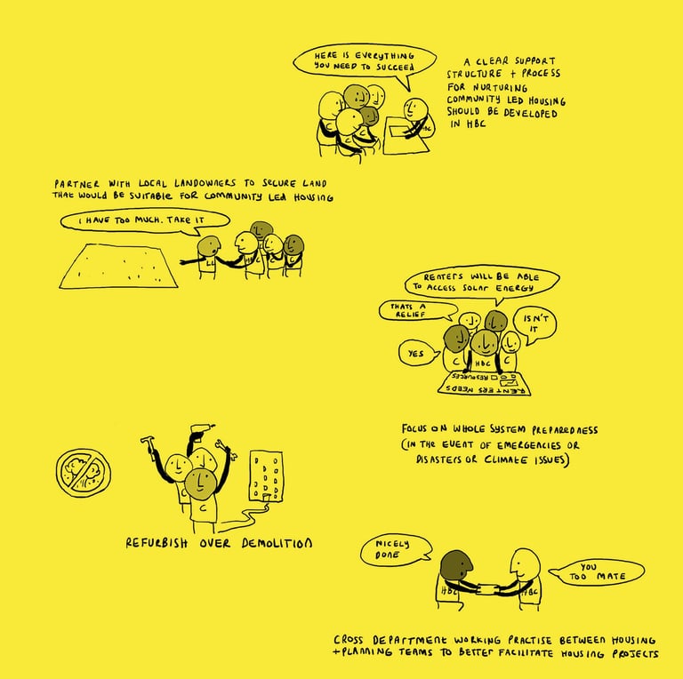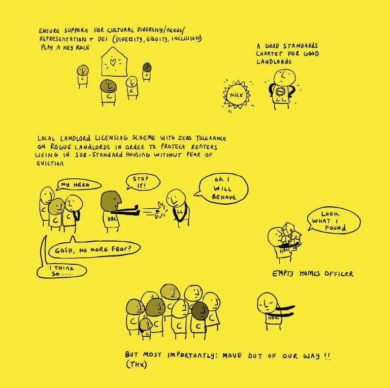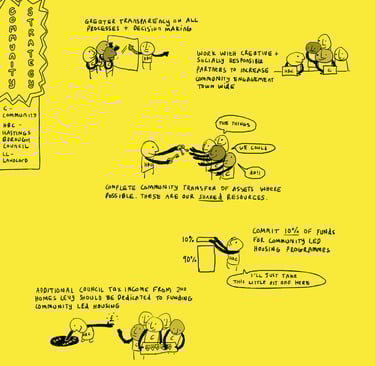 The draft housing strategy is out for consultation and we have made a helpful comic to illustrate all the things we as a community would benefit from. These are all things that we discussed over the months in the housing strategy meetings. It simply can't be business as usual or a tinkering around the edges. A housing crisis is just that, it needs fighting like a crisis, with courage, care and creativity. None of these ideas are new, they are simply forgotten. Let's remember and lets fight for what we need. Take some time out of you day to fill in the strategy and let our council know what we need to live better. As Dawn Dublin said - we need solutions which place more power and decision-making in the hands of local people.