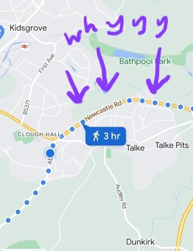 Housegirl was dropped off by their ma to Chester, where had a wander round the cathedral and old shops, many spaces empty. They managed to catch a dear old friend before getting on their way to Staffordshire and Stoke on Trent. As it turns out, they were actually walking to Newcastle Under Lyme. The signs at first were most disturbing, as they were meant to be heading back south, but one sign and business after another read Newcastle!